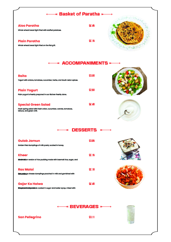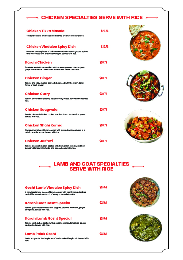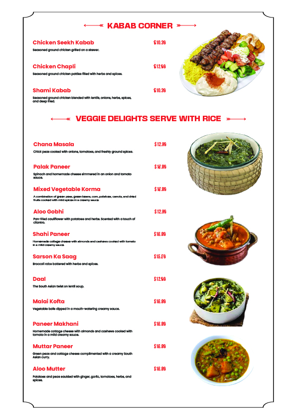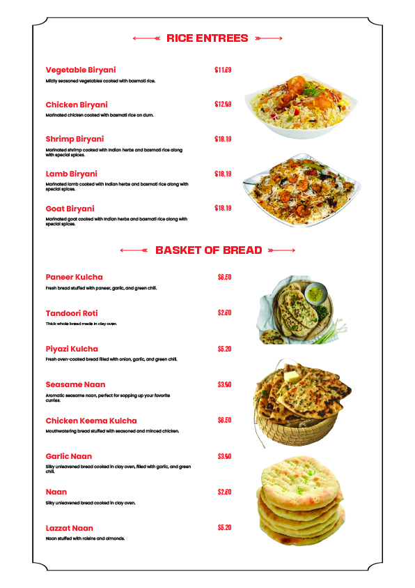 Desserts like Gulab Jamun, Kheer, and Raas Malai provide a sweet end to the meal, while Fish Fry, Fish Roasted, and Shrimp Tikka Masala cater to seafood lovers. The rice section is equally appealing, with options such as Chicken Biryani, Vegetable Biryani, and Lamb Biryani.