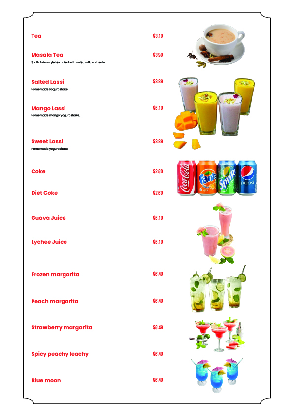 The drink selection is equally varied, featuring refreshing Frozen Margarita, Peach Margarita, and Strawberry Margarita alongside the delightful Spicy Peachy Leachy and Blue Moon. For those looking for more traditional beverages, there are options like Mango Lassi, Leachy Juice, and Guava Juice.