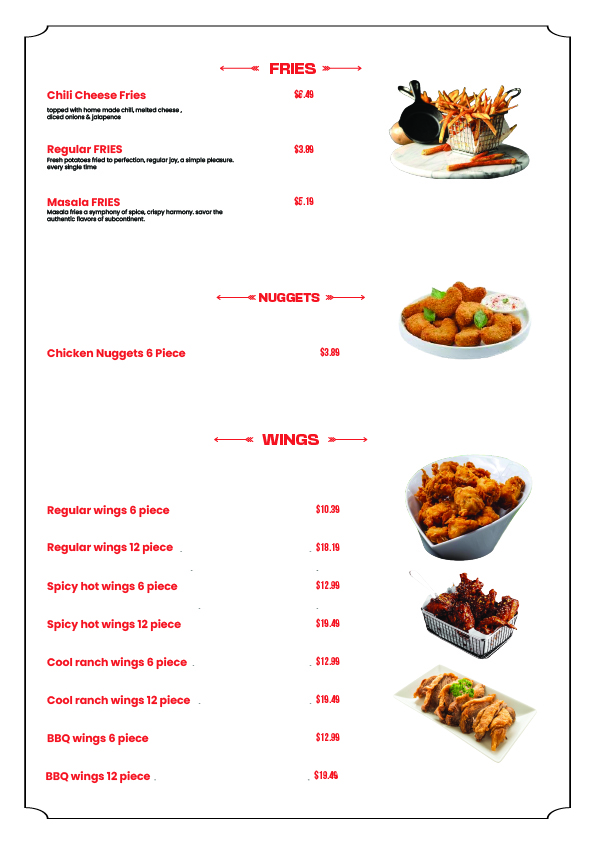 Side dishes such as Chilly Cheese Fries, Regular Fries, and Masala Fries add a flavorful touch to any meal, with Chicken Nuggets (6 pieces for $6.99) providing a tasty snack. Combo deals like the Spicy Chicken Sandwich with Fries and Soda ($9.99) or the milder Mild Chicken Sandwich with Fries and Soda ($8.99) are perfect for those on the go.